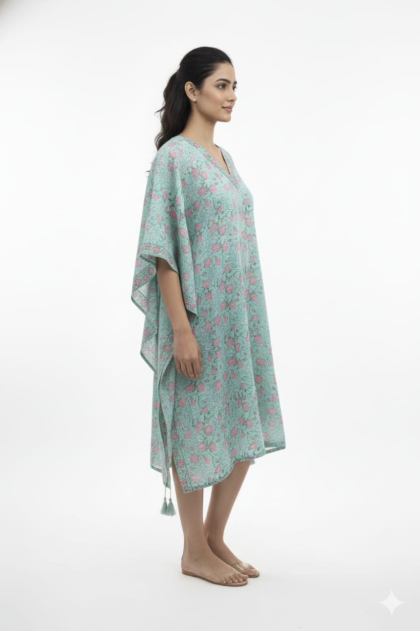 This cotton kaftan dress is crafted for relaxed comfort with a graceful everyday look. Made from soft, breathable cotton fabric, it feels light on the skin and keeps you comfortable throughout the day.