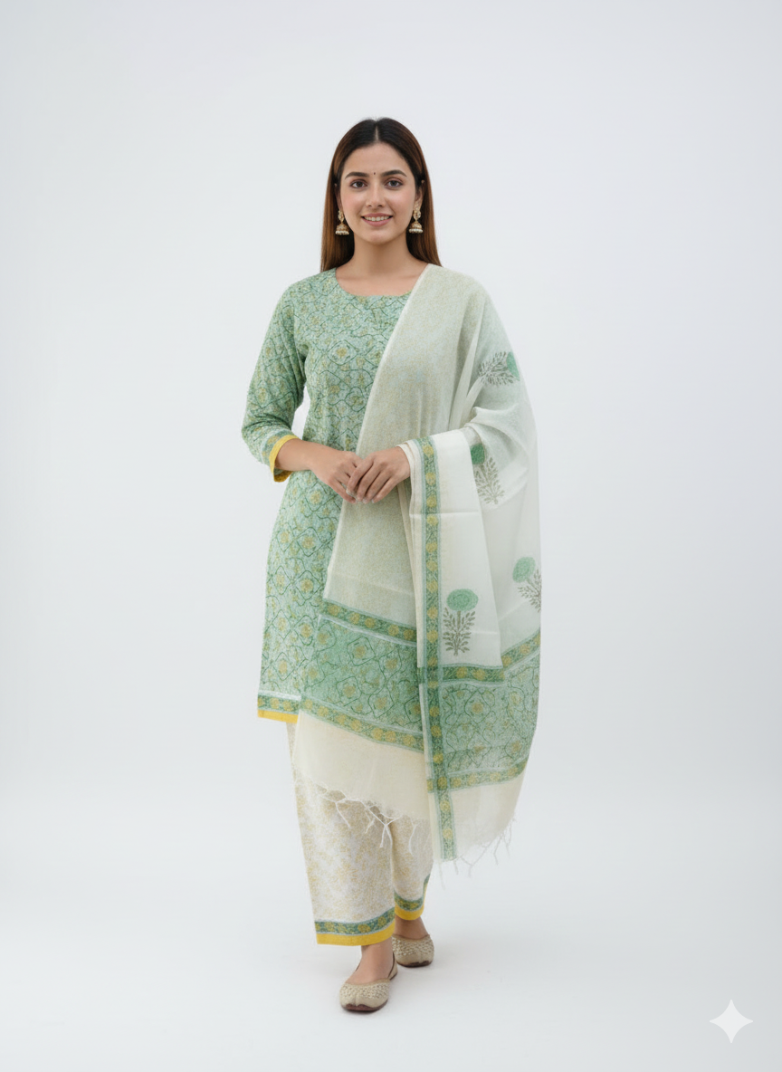 Hand Block Print . Green and white cotton kurti pant dupatta set