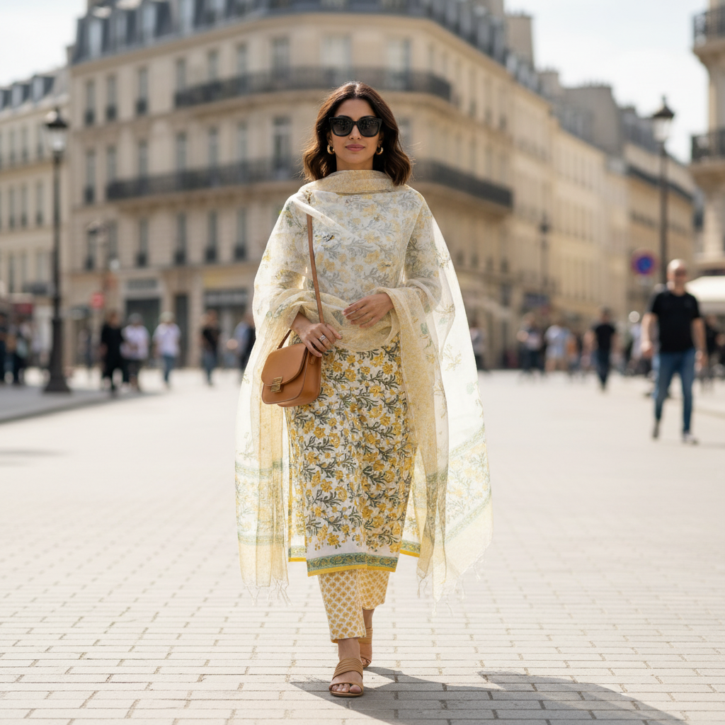 The floral hand block print adds a subtle yet sophisticated touch, making it perfect for casual outings, office wear, festive gatherings, or summer occasions. Paired with a complementing bottom and a lightweight dupatta, this set blends tradition with modern elegance.