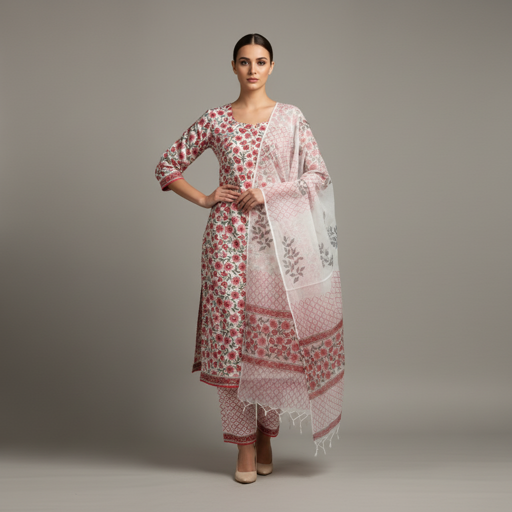 The floral hand block print adds a subtle yet sophisticated touch, making it perfect for casual outings, office wear, festive gatherings, or summer occasions. Paired with a complementing bottom and a lightweight dupatta, this set blends tradition with modern elegance.