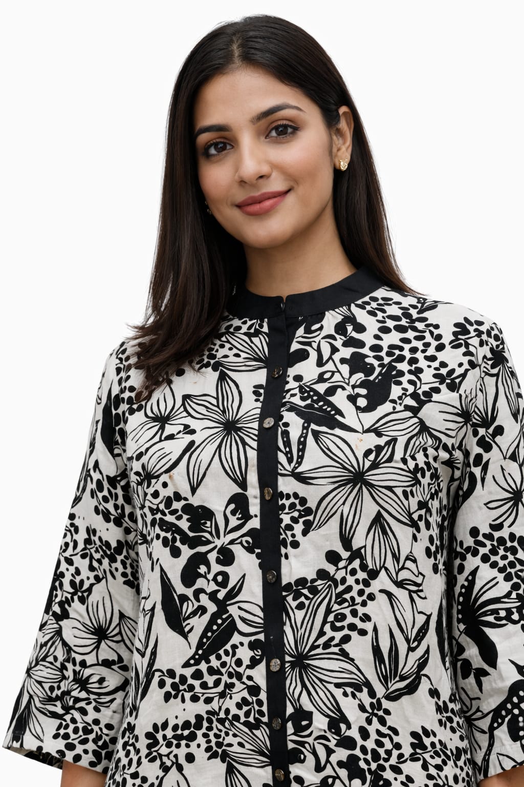 đ¤Â Classic Monochrome Floral Linen Kurti Dress đ¤